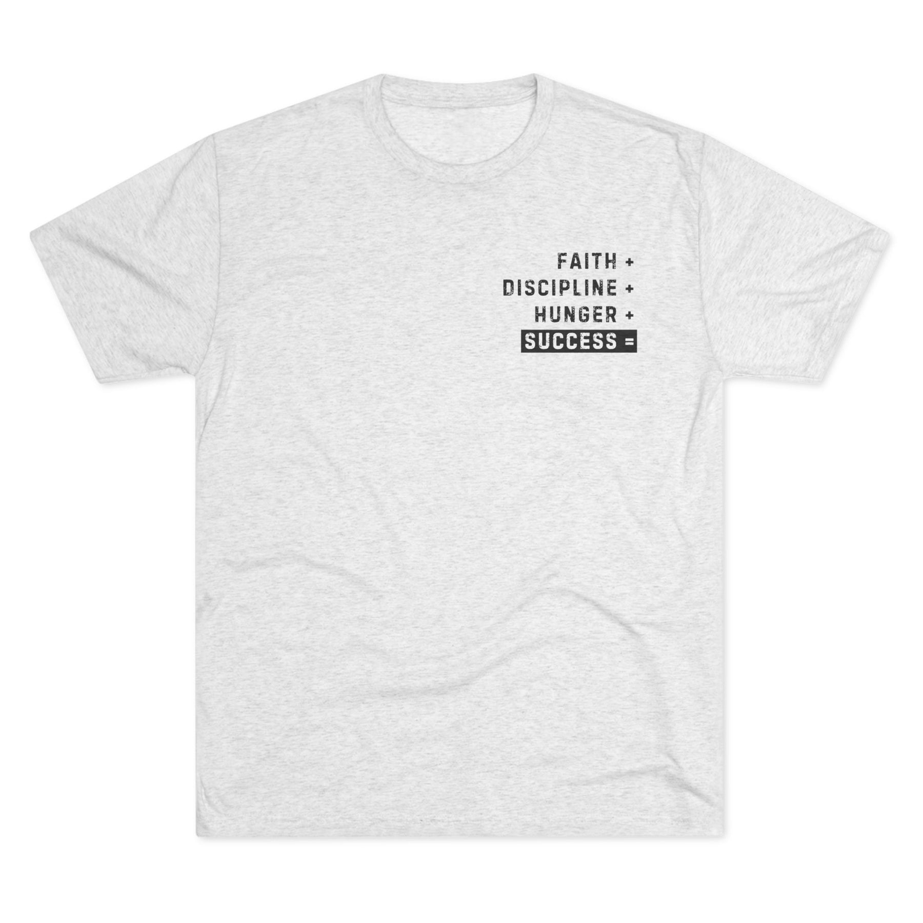 A unisex tri-blend crew tee featuring a design that embodies faith, discipline, and hunger, representing the path to success. This comfortable and durable shirt is perfect for those seeking motivation and inspiration in their daily life. Ideal for individuals with a strong work ethic and ambitious goals, it can be worn on casual days or during workouts. Perfect for gifting on birthdays, graduations, or other milestones.