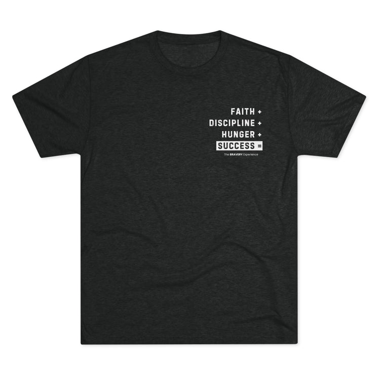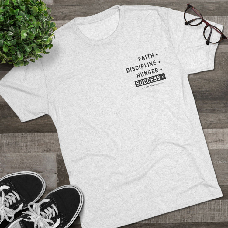 A unisex tri-blend crew tee featuring a design that embodies faith, discipline, and hunger, representing the path to success. This comfortable and durable shirt is perfect for those seeking motivation and inspiration in their daily life. Ideal for individuals with a strong work ethic and ambitious goals, it can be worn on casual days or during workouts. Perfect for gifting on birthdays, graduations, or other milestones.